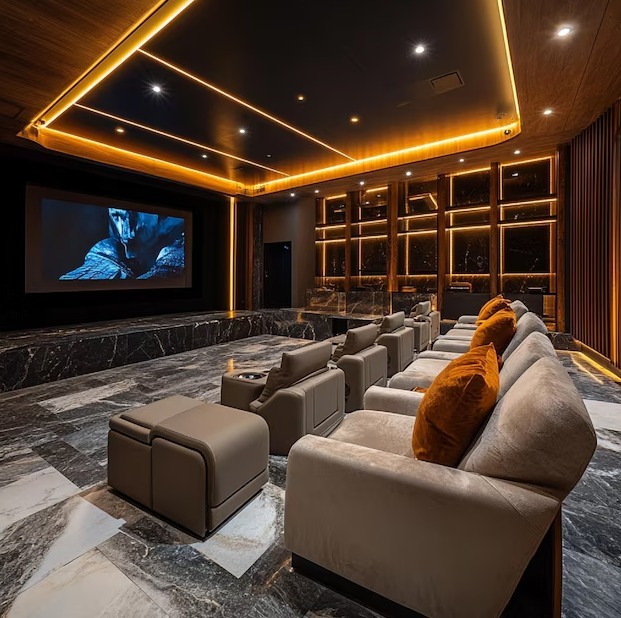 Wall paneling, acoustic materials, and projector or screen placement are aligned with room dimensions. For living rooms, space planning ensures comfortable seating arrangements, visual balance, and smooth circulation. Interior styling elements like rugs, artwork, and soft lighting add warmth.